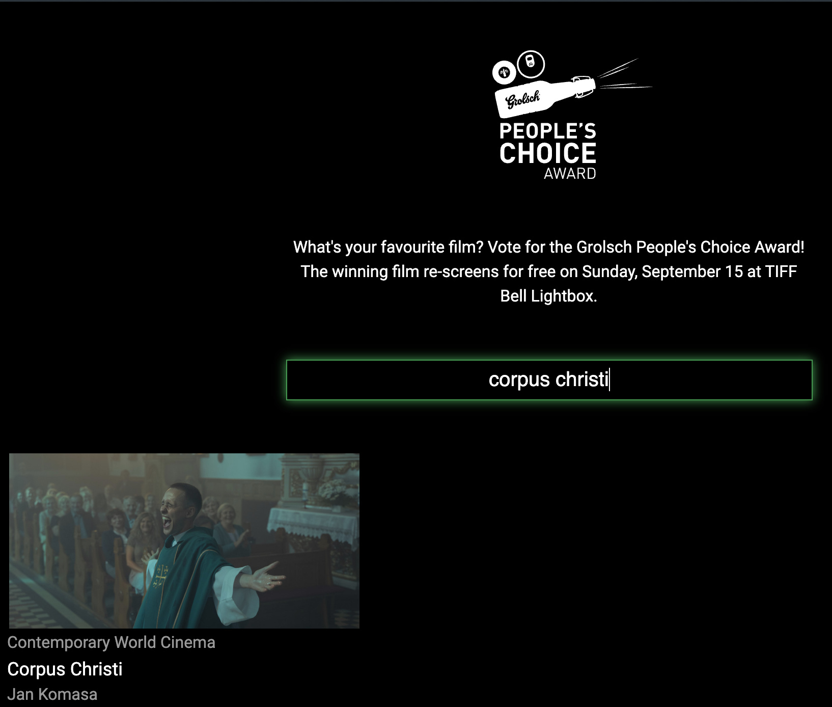 Pomyślałem, że nic się by nie stało, gdybyśmy pomogli zdobyć temu filmowi nagrodę publiczności na właśnie odbywającym się festiwalu w Toronto. Wystarczy wejść na stronę https://tiff.net/vote i wpisać tytuł “Corpus Christi”, kliknąć na kadr z filmu, potem wybrać, że mamy zamiar zobaczyć ileś tam filmów i wpisać prawdziwy adres email i nacisnąć “Vote Now!”