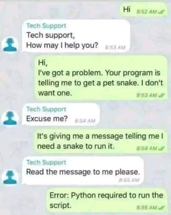 Jestem ogólnie przeciwnikiem hodowania jakichkolwiek zwierząt dla przyjemności, więc węża nie mam i nie będę miał, nie licząc oczywiście Pythona w komputerze.
